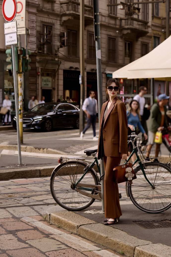 在色彩上,巧用同色系叠穿搭配出层次感。棕色西服外套,从内搭到外套深浅和谐,这是复古风不显老气的关键!棕系自带“时光滤镜”,不刻意怀旧,反而凸显质感。内搭的修身针织或丝质背心,悄悄露肤,打破沉闷,是“飒爽”中藏一丝“温柔”的心跳设计。