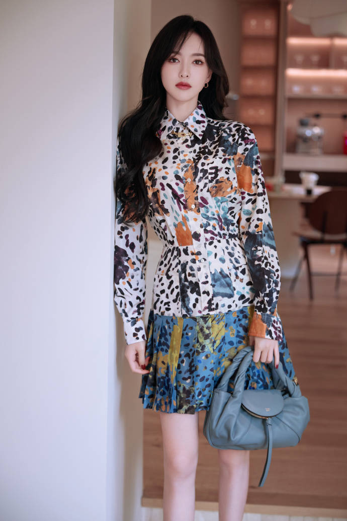 在色彩运用上,上身斑驳油画感的衬衫,色彩丰富但色调偏灰,仿佛从老油画里走出来,复古却不刺眼。下身蓝黄交织的格纹百褶裙,色彩呼应上衣且通过规则格纹“镇住”杂乱感。